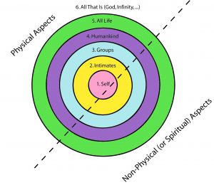 As we increase our awareness and are able to lay aside painful burdens from the past, we can engage more deeply with our own domains, considering both the physical aspects of each one and the non-physical aspects. We can gain the ability to be mindful of more aspects of life at once and see more clearly how the domains affect each other. Many, perhaps most of us, tend to concentrate our attention on our inner three domains as these are the ones that seem to affect us most strongly. When considered logically, the well-being of our species and of all life on the planet that sustains us is quite important as well. For some people, the 6th domain is central to their lives; for others, it may not seem very real.